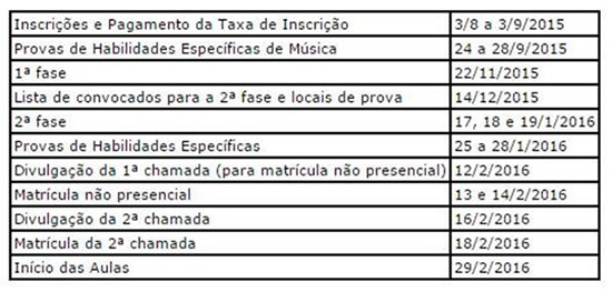 Antes da primeira fase haverão provas de Habilidades Específicas para candidatos aos cursos de Música (no período de 24 a 28 de setembro). Para os demais cursos (Arquitetura e Urbanismo, Artes Cênicas, Artes Visuais e Dança), as provas de Habilidades Específicas ocorrem de 25 a 28 de janeiro de 2016. A primeira chamada será divulgada pela Comvest dia 12 de fevereiro. Mais informações no endereço http://www.comvest.unicamp.br/vest2016/vest2016.html