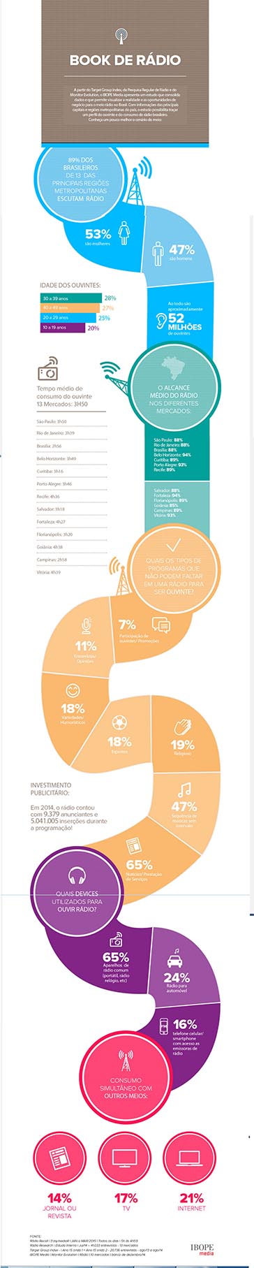 Confira mais informações sobre o consumo de rádio no Brasil e sobre o perfil dos ouvintes no infográfico disponível no link http://www.ibopemedia.com/book-de-radio/.