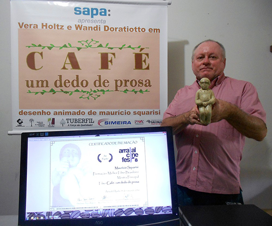 Selecionado por critérios de qualidade técnica, relevância contextual e ineditismo, o longa metragem “Café, um dedo de prosa”, do diretor campineiro Maurício Squarisi, do Núcleo de Cinema de Animação de Campinas, conquistou o primeiro lugar na mostra principal do "Arraial Cine Fest", Festival Internacional de Cinema e Vídeo de Arraial d´Ajuda, em Porto Seguro/Bahia, realizado entre os dias 29 de fevereiro a 4 de março.